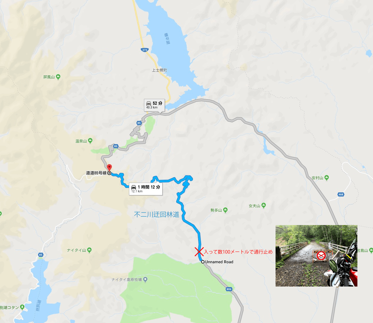 気を取り直して、ナイタイ高原から糠平(ぬかびら)湖へ抜ける約12kmの林道、不二川迂回林道を通って、キャンプ場へ戻ろうと思うが、そちらも通行止め。残念!